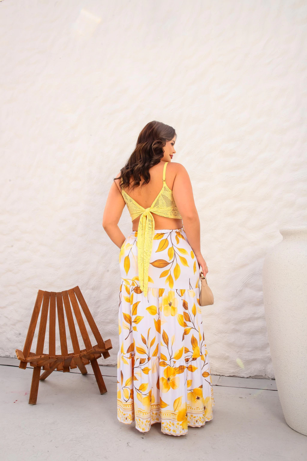Nas costas, o destaque fica por conta da amarração, que permite ajustar a peça ao corpo, proporcionando caimento perfeito e garantindo ainda mais elegância.